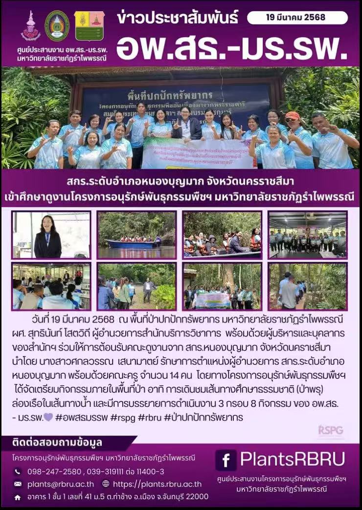 วันที่ 19 มีนาคม 2568 ณ พื้นที่ป่าปกปักทรัพยากร มหาวิทยาลัยราชภัฏรําไพพรรณี ผศ. สุทธินันท์ โสตวิถี ผู้อำนวยการสำนักบริการวิชาการ พร้อมด้วยผู้บริหารและบุคลากร ของสำนักฯ ร่วมให้การต้อนรับคณะดูงานจาก สกร.หนองบุญมาก จังหวัดนคราชสีมา นำโดย นางสาวศกลวรรณ เสนามาตย์ รักษาการตำแหน่งผู้อำนวยการ สกร.ระดับอำเภอหนองบุญมาก พร้อมด้วยคณะครู จำนวน 14 คน โดยทางโครงการอนุรักษ์พันธุกรรมพืชฯ ได้จัดเตรียมกิจกรรมภายในพื้นที่ป่า อาทิ การเดินชมเส้นทางศึกษาธรรมชาติ (ป่าพรุ) ล่องเรือในเส้นทางน้ำ และมีการบรรยายการดำเนินงาน 3 กรอบ 8 กิจกรรม ของ อพ.สธ.- มร.รพ.